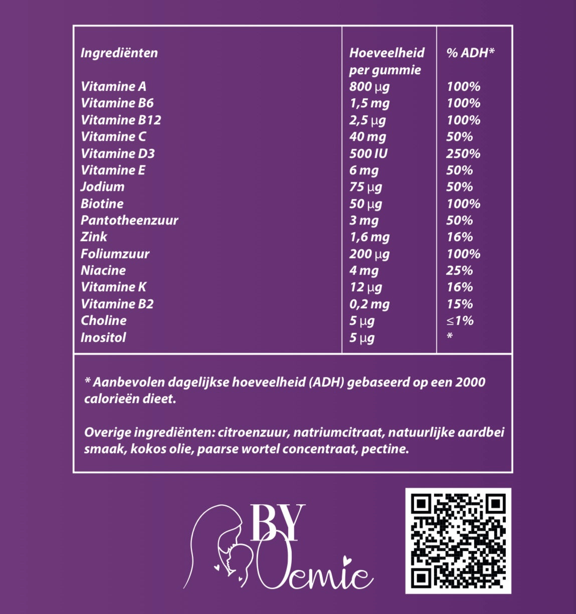 Elke gummie bevat een zorgvuldig geselecteerde mix van vitamines en mineralen — alles wat jij en jouw kindje nodig hebben vanaf het allereerste begin. 🤰💛